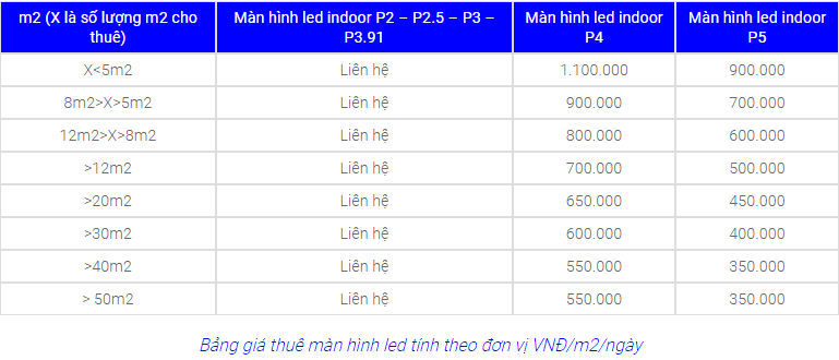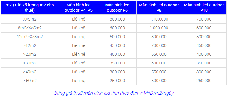 Theo bảng báo giá thuê màn hình led trong nhà/ngoài trời phía trên, nếu khách hàng thuê màn hình led với diện tích càng lớn thì chi phí sẽ càng rẻ.